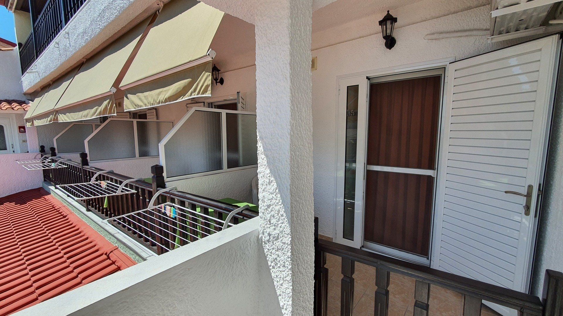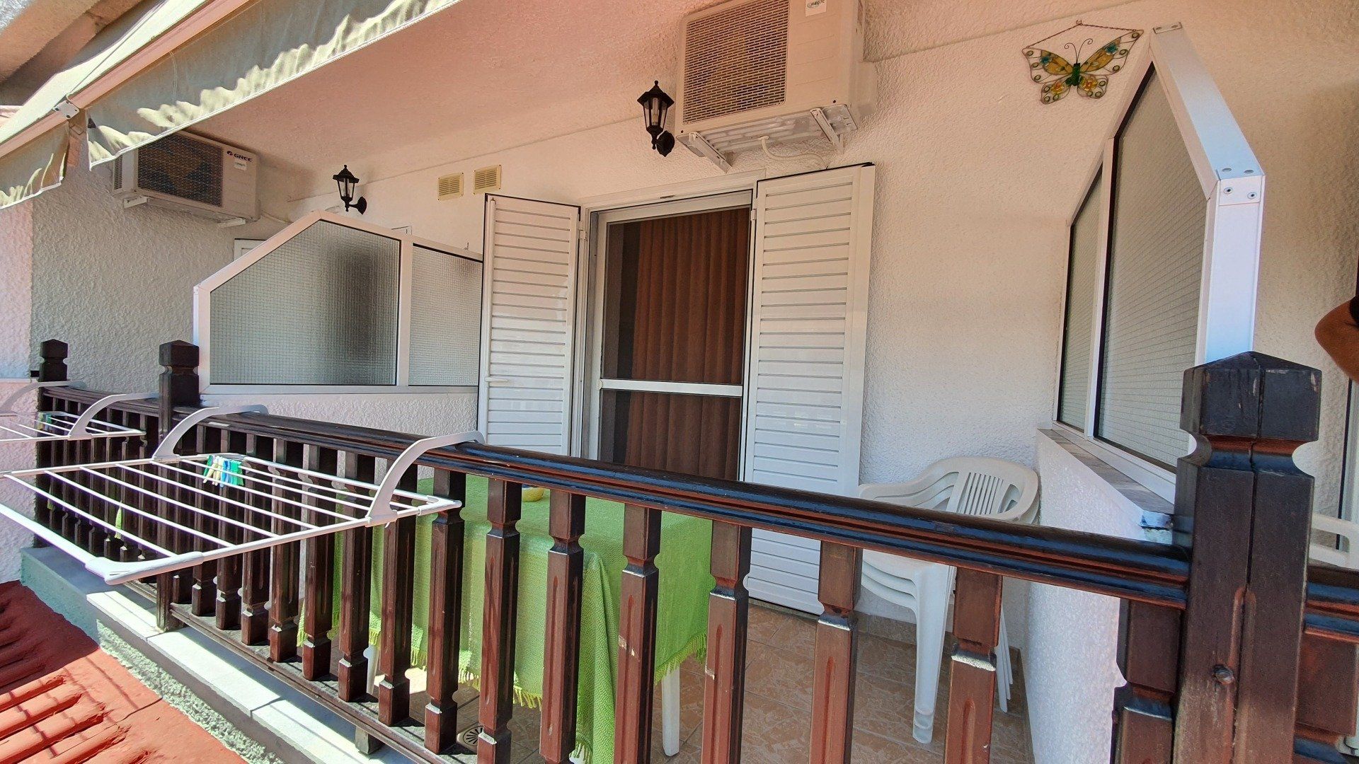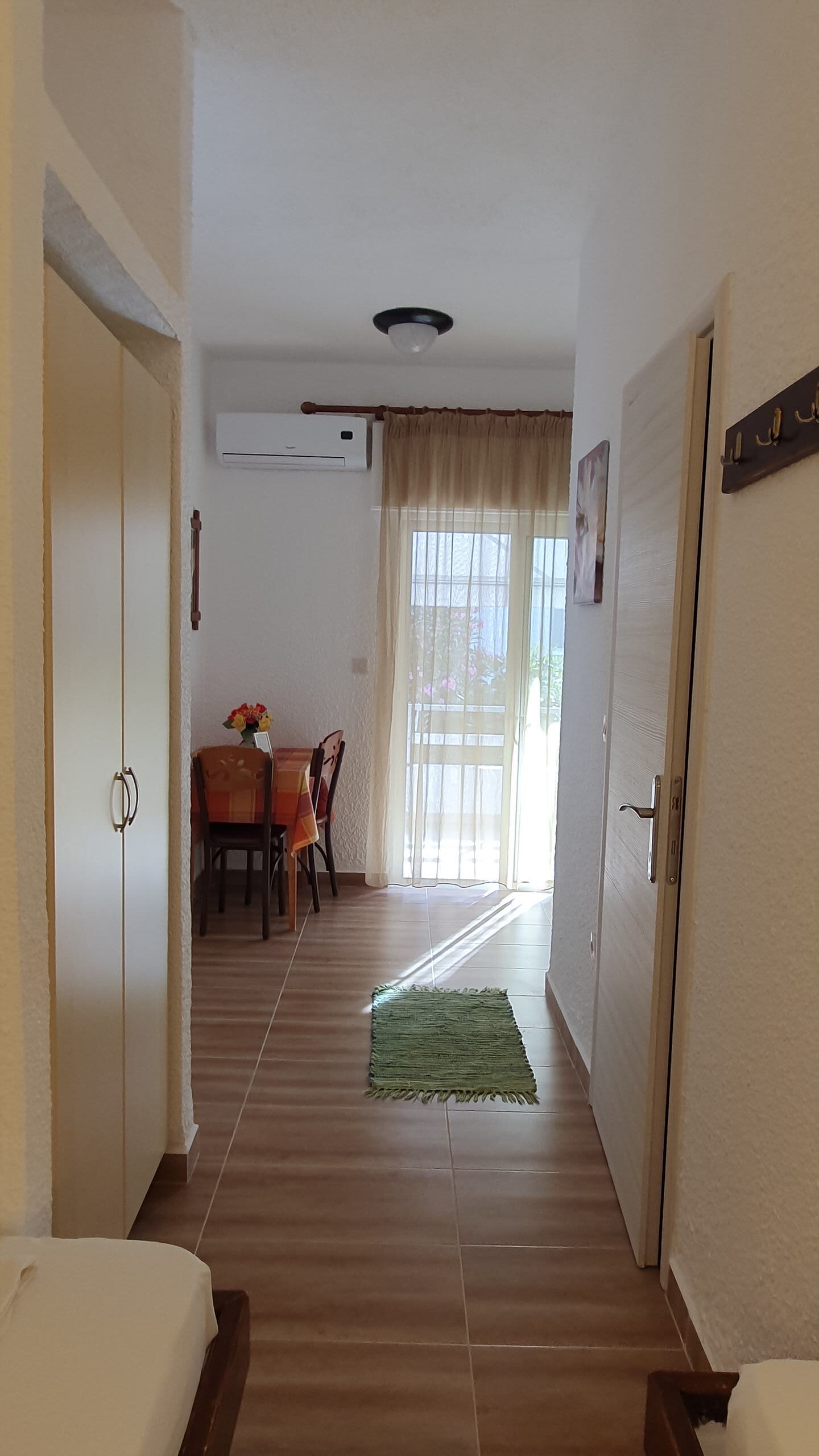Our three-person apartments are generally located on the second floor. Access is possible from the front or via a staircase in the courtyard. The apartment has a separate bedroom with a double bed. The kitchenette and single bed are located in the front section.