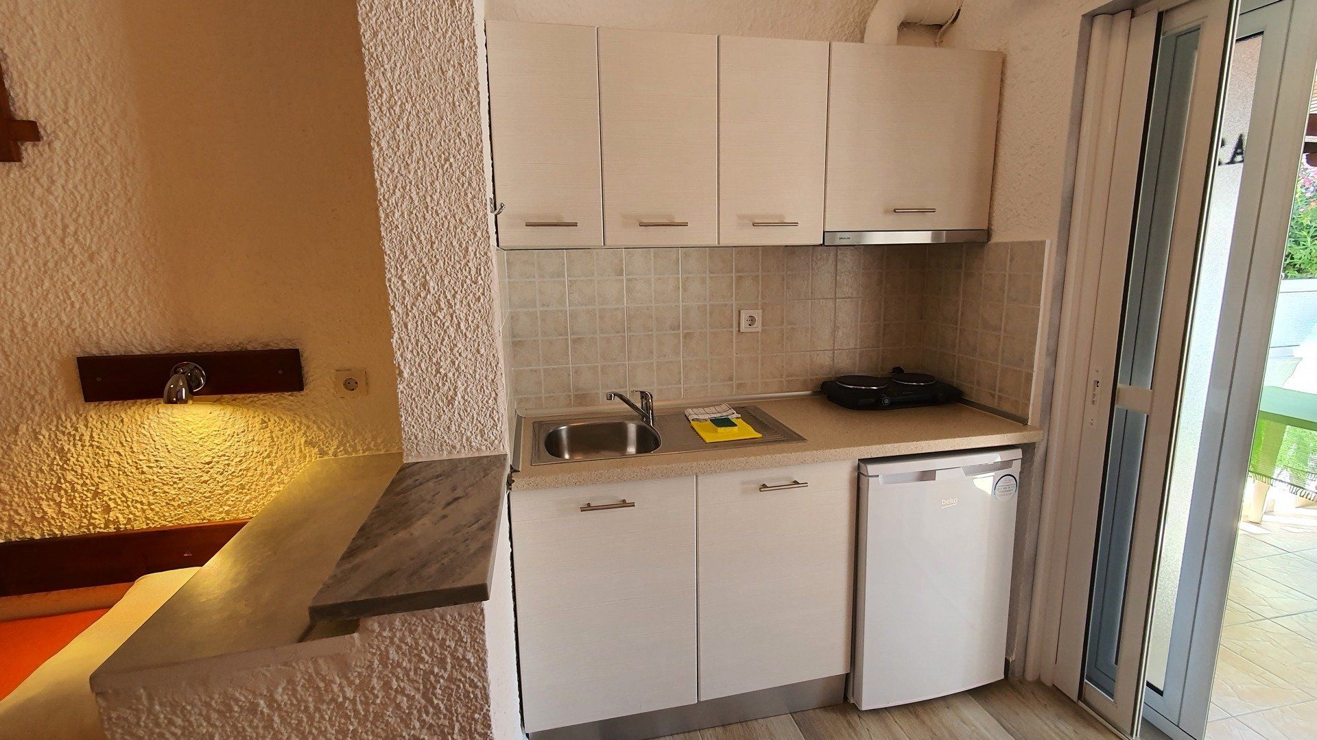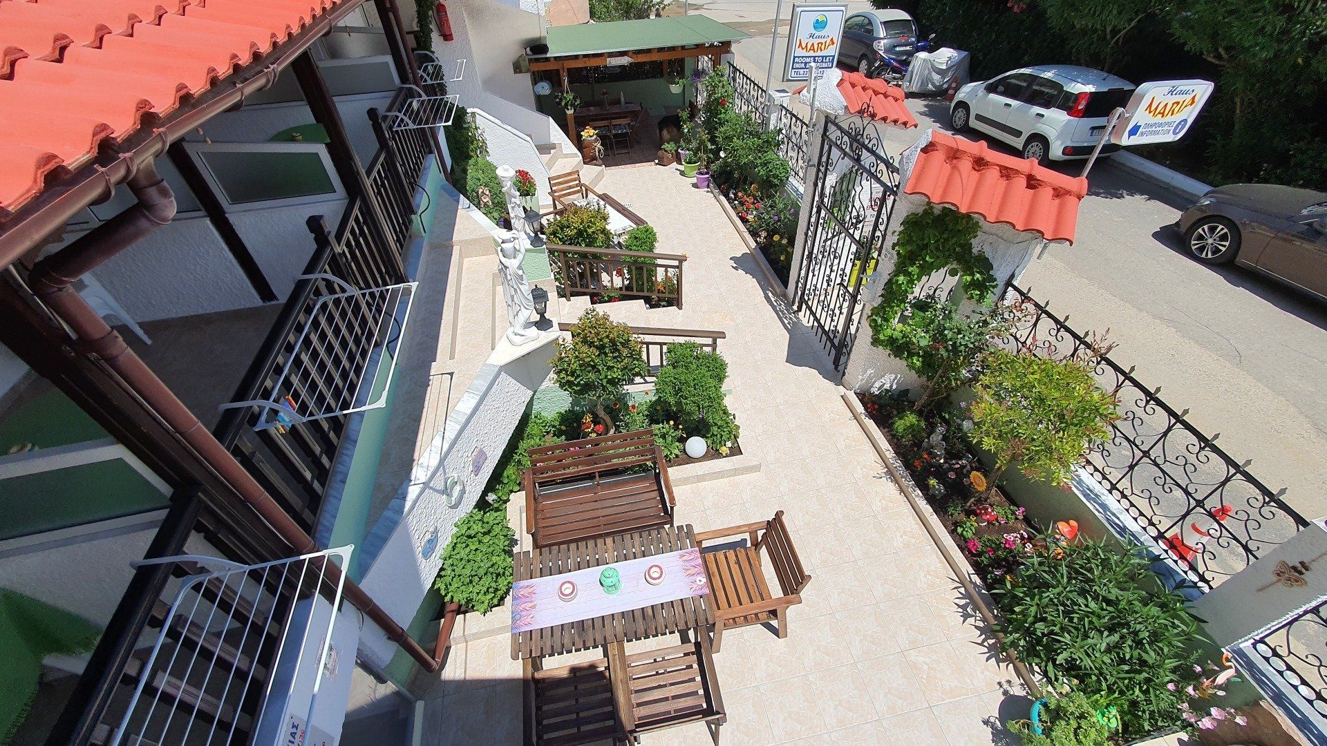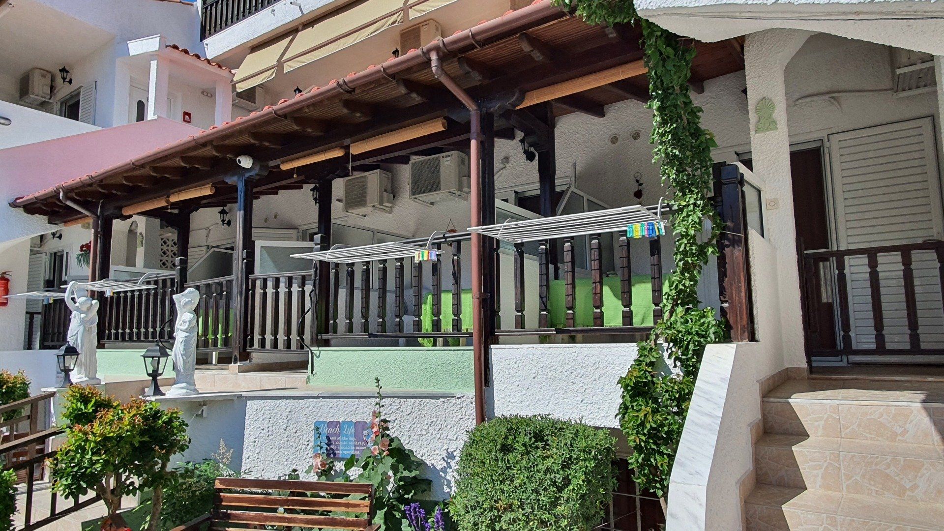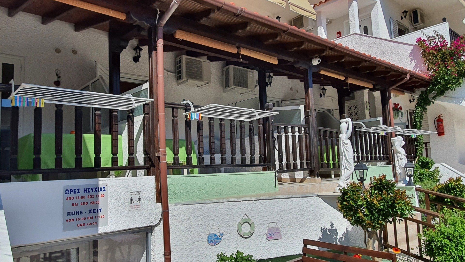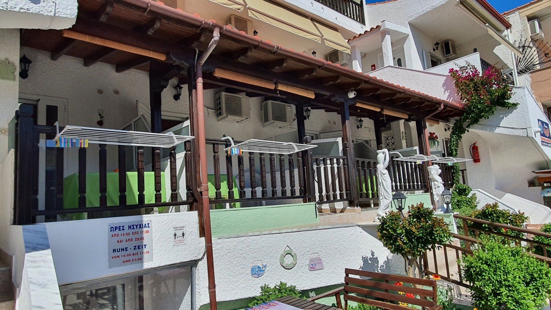 All our apartments/studios have a bathroom with shower and toilet, a balcony, a fully equipped kitchenette (with 2-burner stove, coffee machine, refrigerator with freezer, pots, plates, etc.), satellite TV (4 German channels), Wi-Fi, air conditioning and fans.